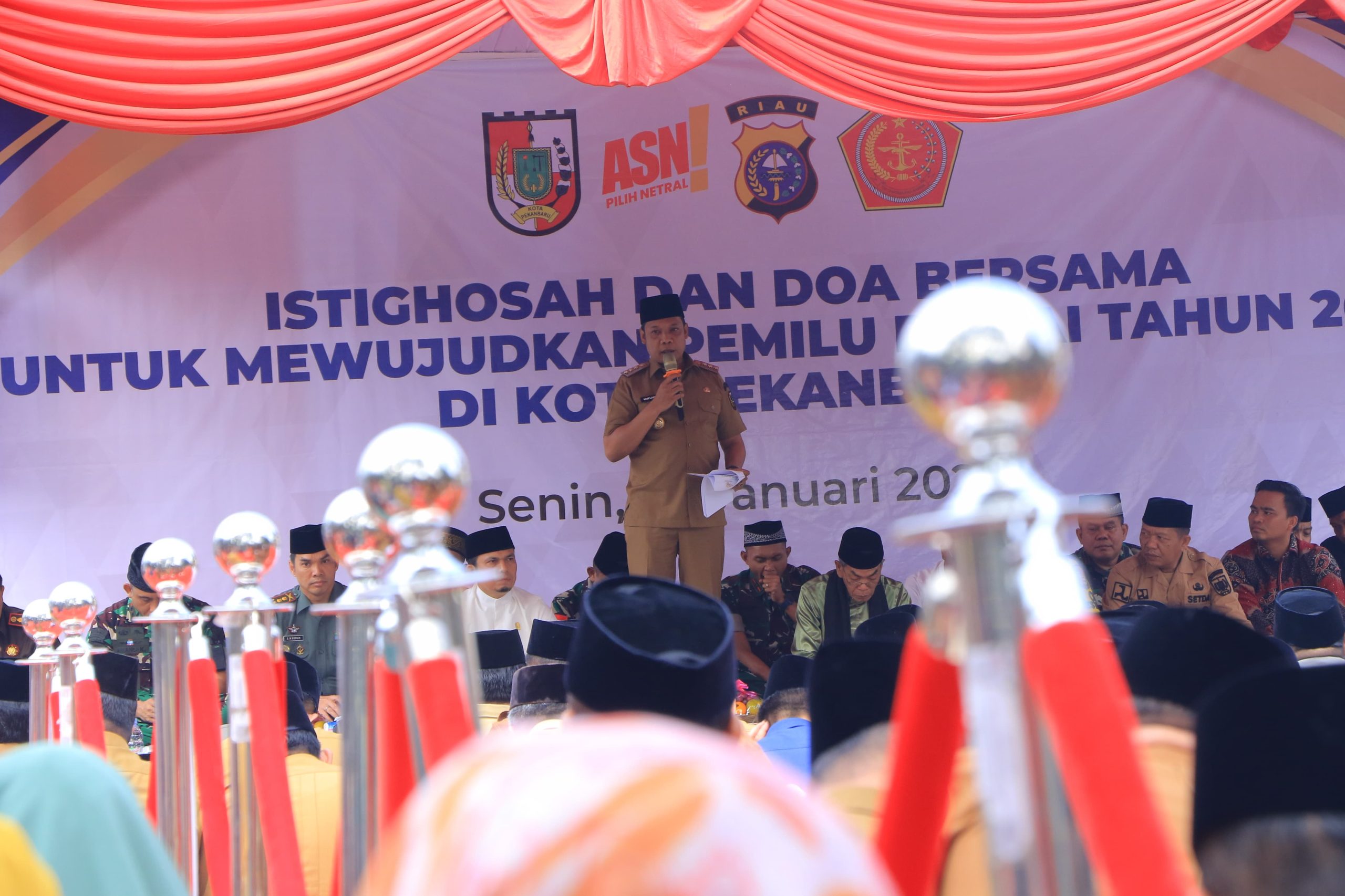 Penjabat (Pj) Walikota Pekanbaru, Muflihun dalam kegiatan Doa Istigasah di lapangan Mal Pelayanan Publik (MPP), Senin (22/1/2024) pagi mengatakan, pemerintah kota berupaya untuk menyukseskan rangkaian Pemilu 2024.