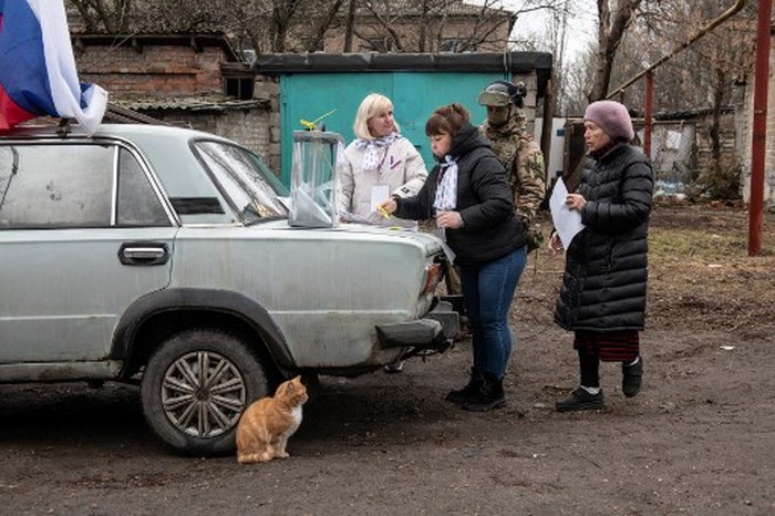 Sebuah video dari Luhansk memperlihatkan seorang wanita tua di dalam apartemennya mengisi surat Pemilu dan memasukkannya ke dalam kotak suara, sementara seorang pria berseragam tentara berdiri di dekatnya dengan senapan tersandang di dadanya. Para pejabat Ukraina mengatakan taktik intimidasi seperti itu adalah hal biasa dan bertujuan untuk memaksa masyarakat memberikan suara mereka kepada Putin.