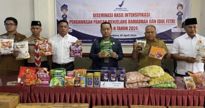 “Selama Maret 2024, Balai Besar POM di Pekanbaru telah melakukan intensifikasi pengawasan pangan terhadap 71 sarana peredaran pangan dengan hasil 50 sarana memenuhi ketentuan dan 21 sarana tidak memenuhi ketentuan. Pada sarana yang tidak memenuhi ketentuan ditemukan 86 item produk pangan tanpa izin edar, palsu dan expire dengan jumlah 2.467 pcs dengan nilai ekonomi total Rp 168 juta,” lanjutnya.