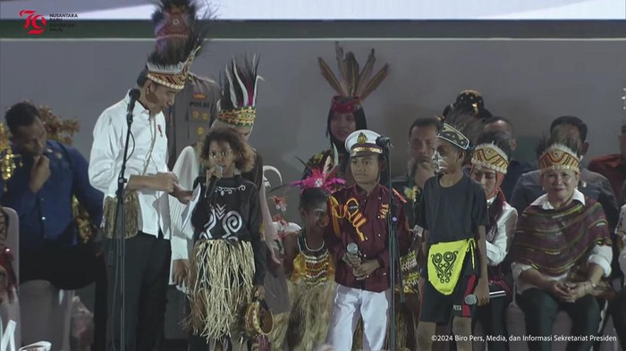 “Papua Barat, Papua Pegunungan, Papua Tengah,” jawab kedua anak yang maju. Iriana pun memberi hadiah kepada anak itu.
