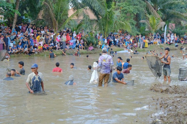BABAT SUPAT – Heboh, masyarakat Babat Supat sangat bergembira menangkap ikan (Bekarang) bersama-sama di Embung Senja Kecamatan Babat Supat, Kabupaten Muba, Sabtu (13/7/2024).