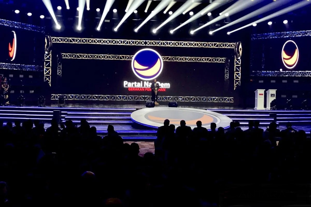 Kongres III Partai NasDem Tahun 2024 dibuka Presiden Joko Widodo yang hadir mengenakan kemeja berwarna biru khas Partai NasDem.