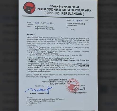 Dalam SK yang diterima CAKAPLAH.com, penetapan Kaderismanto sebagai pimpinan DPRD Riau didasarkan pada beberapa pertimbangan penting. Pertama, DPP PDI Perjuangan memperhatikan surat instruksi terkait usulan pimpinan DPRD yang diajukan pada 4 September 2024.