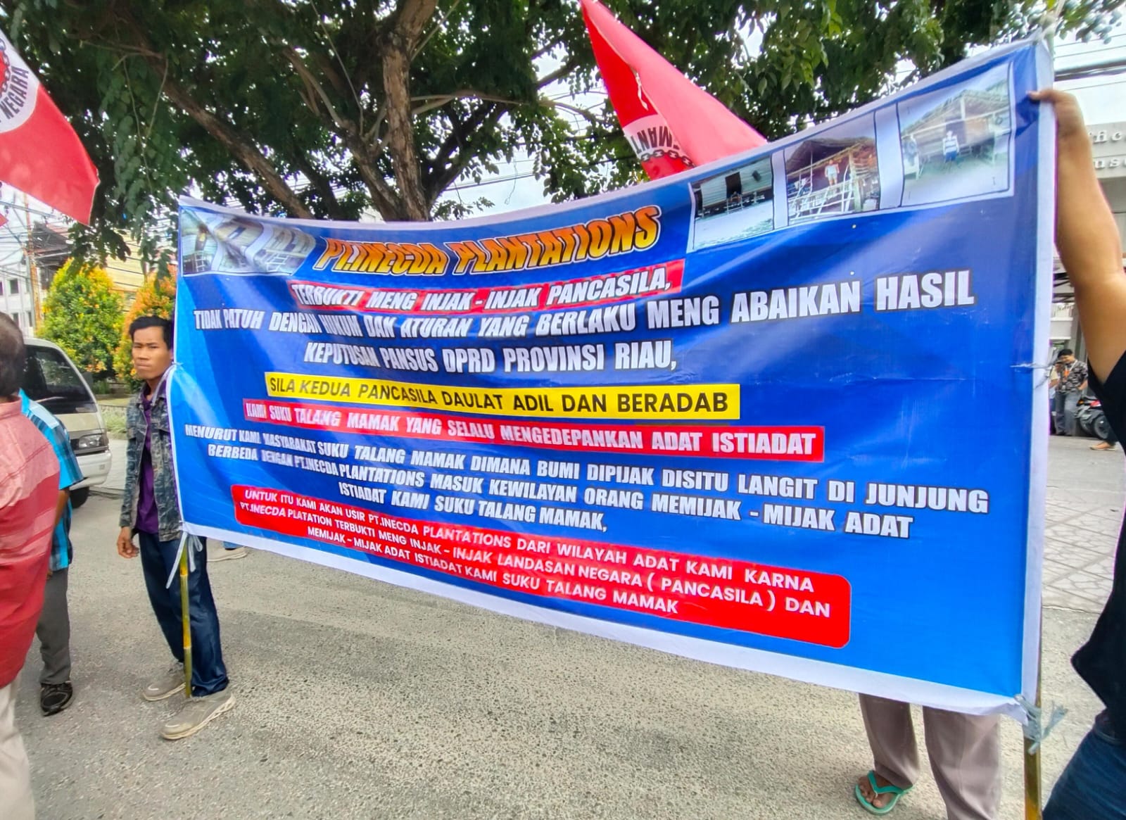 PEKANBARU – Ratusan masyarakat dari Komunitas Adat Terpencil (KAT) Suku Talang Mamak menuntut kewajiban pembangunan kebun plasma dari PT Gandaerah Hendana dan PT Inecda Plantation. Warga menggelar unjuk rasa di depan kantor perusahaan terafiliasi Samsung Grup ini di kompleks perkantoran Mega Asri, Jalan Arifin Ahmad, Pekanbaru, Selasa (8/10/2024).
