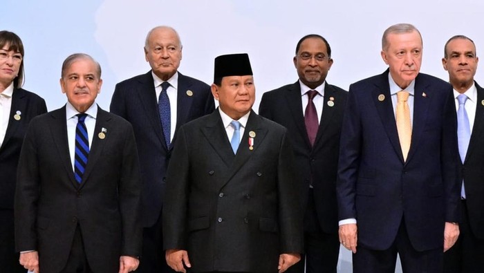 Setelahnya, Prabowo mengikuti sesi foto bersama seluruh delegasi KTT D-8 yang hadir. Pada momen ini, Prabowo tampak berdiri di antara Presiden Turkiye Recep Tayyip Erdogan dan Perdana Menteri (PM) Pakistan Shehbaz Sharif.