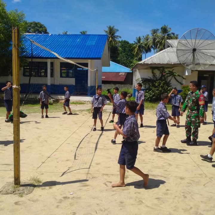 TAPTENG – Babinsa Koramil 02/Sorkam Kopda Roi Saragi melatih siswa SMPN Sorkam bermain bola voli di lapangan olahraga SMPN Sorkam, Kelurahan Naipos Pos Barat, Kecamatan Sorkam, Kabupaten Tapanuli Tengah, Senin (06/01/2025).