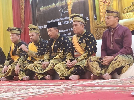 Dalam prosesi yang berlangsung khidmat dan sakral, Jenderal Listyo Sigit Prabowo mengenakan atribut adat seperti tanjak, selempang, keris, dan kalung, serta menjalani ritual tepuk tepung tawar, sebagai simbol penerimaan dan restu dari masyarakat adat.