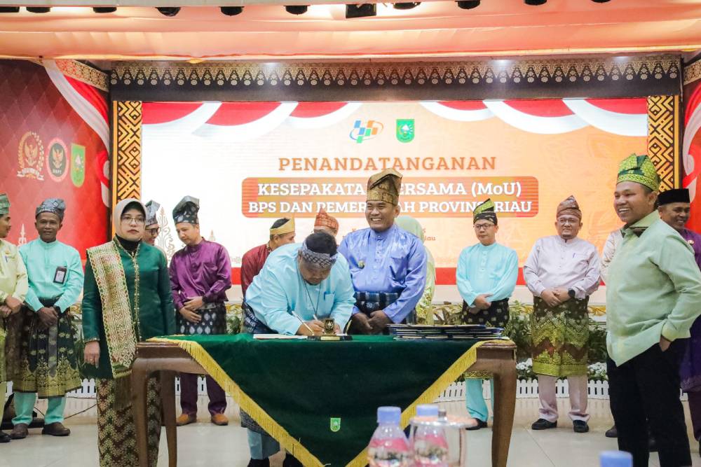 PEKANBARU – Pemerintah Provinsi Riau bersama seluruh kabupaten/kota resmi menandatangani Nota Kesepahaman (MoU) dengan Badan Pusat Statistik (BPS) RI. Langkah ini merupakan komitmen kuat untuk mewujudkan program Satu Data Indonesia sesuai amanat Peraturan Presiden Nomor 39 Tahun 2019. Penandatanganan berlangsung di Gedung Daerah Balai Serindit, Pekanbaru, pada Kamis (7/8/2025) malam.