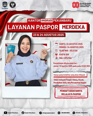 PEKANBARU – Dalam rangka memperingati HUT ke-80 Kemerdekaan Republik Indonesia, Kantor Imigrasi Kelas I TPI Pekanbaru menggelar Layanan Paspor Merdeka di Mal Ciputra Seraya Pekanbaru pada 23–24 Agustus 2025.