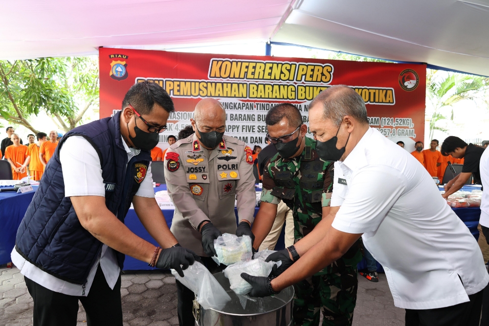 Direktur Reserse Narkoba Polda Riau, Kombes Pol. Putu Yudha Prawira, merinci barang bukti yang dimusnahkan. Total ada enam jenis narkotika dari 18 kasus dan 34 tersangka, dengan rincian: 121,52 kg sabu, 4.592 butir ekstasi, 647 butir happy five, 257,8 gram heroin, 34,85 gram ketamin, dan 624 cartridge vape liquid.