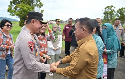 PINANGSORI – Bupati Tapanuli Tengah Masinton Pasaribu, SH, MH didampingi Ketua TP PKK Tapanuli Tengah Ny Rismawaty Masinton Pasaribu bersama Wakil Bupati Tapanuli Tengah Mahmud Efendi didampingi Staf Ahli I TP PKK Tapanuli Tengah Ny Masnoni Mahmud Efendi menyambut kedatangan Kapolda Sumatera Utara Irjen Pol Whisnu Hermawan Februanto didampingi Ketua Bhayangkari Daerah Sumatera Utara Ny Mona Whisnu Hermawan di Bandara FL Tobing Pinang Sori, Senin (15/09/2025).