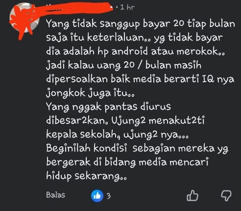 HHN lebih rinci dalam komentar menyampaikan,”yang tidak sanggup bayar Rp.20.000 ribu tiap bulan saja itu keterlaluan,yang tidak bayar dia ada hp android atau merokok,jadi kalau uang Rp.20.000 ribu perbulan masih dipersoalkan baik media berarti IQ nya Jongkok juga itu.
