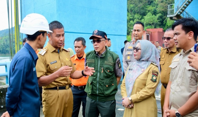 KUOK – Meningkatnya intensitas curah hujan di wilayah hulu menyebabkan elevasi air Waduk PLTA Koto Panjang naik signifikan. Menanggapi kondisi tersebut, Bupati Kampar H. Ahmad Yuzar, S.Sos, MT bersama Wakil Bupati Dr. Hj. Misharti, S.Ag, M.Si meninjau langsung kesiapan pintu pelimpah (Spillway Gate) di Desa Merangin, Selasa (30/12/2025).