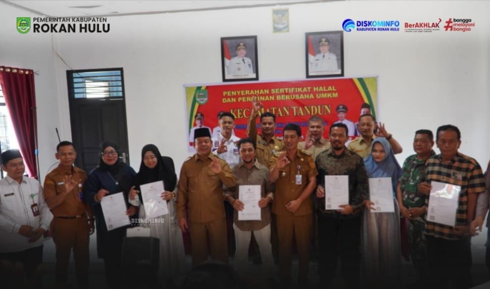 Acara ditutup dengan penyerahan sertifikat secara simbolis kepada perwakilan pelaku UMKM. Turut hadir mendampingi Wabup, Kepala Dinas Koptransnaker Rohul Suparno, S.Hut., serta unsur Forkopimcam setempat. Melalui kegiatan ini, Pemkab Rokan Hulu berharap UMKM di Kecamatan Tandun dapat segera “naik kelas” dan menjadi motor penggerak ekonomi kerakyatan di Negeri Seribu Suluk.